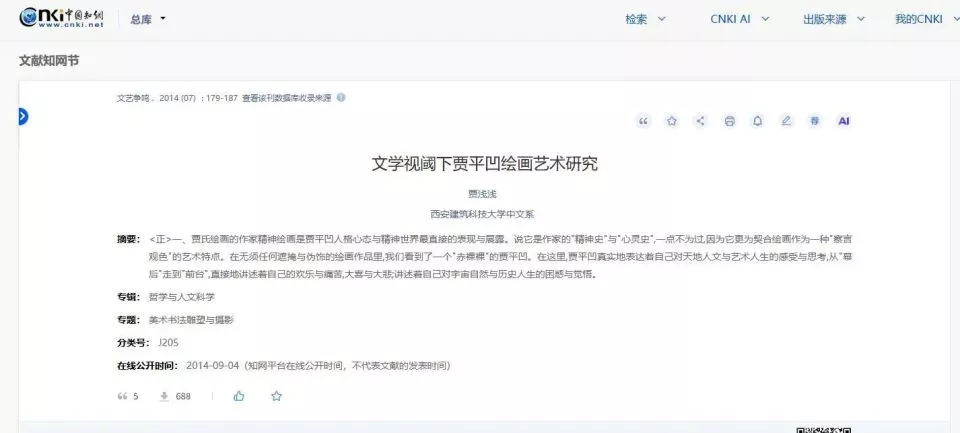 9日上午,极目新闻通过知网等渠道查询获悉,《文学视阈下贾平凹绘画艺术研究》一文,系贾浅浅2014年任西安建筑科技大学教师时所发表,目前可正常下载。