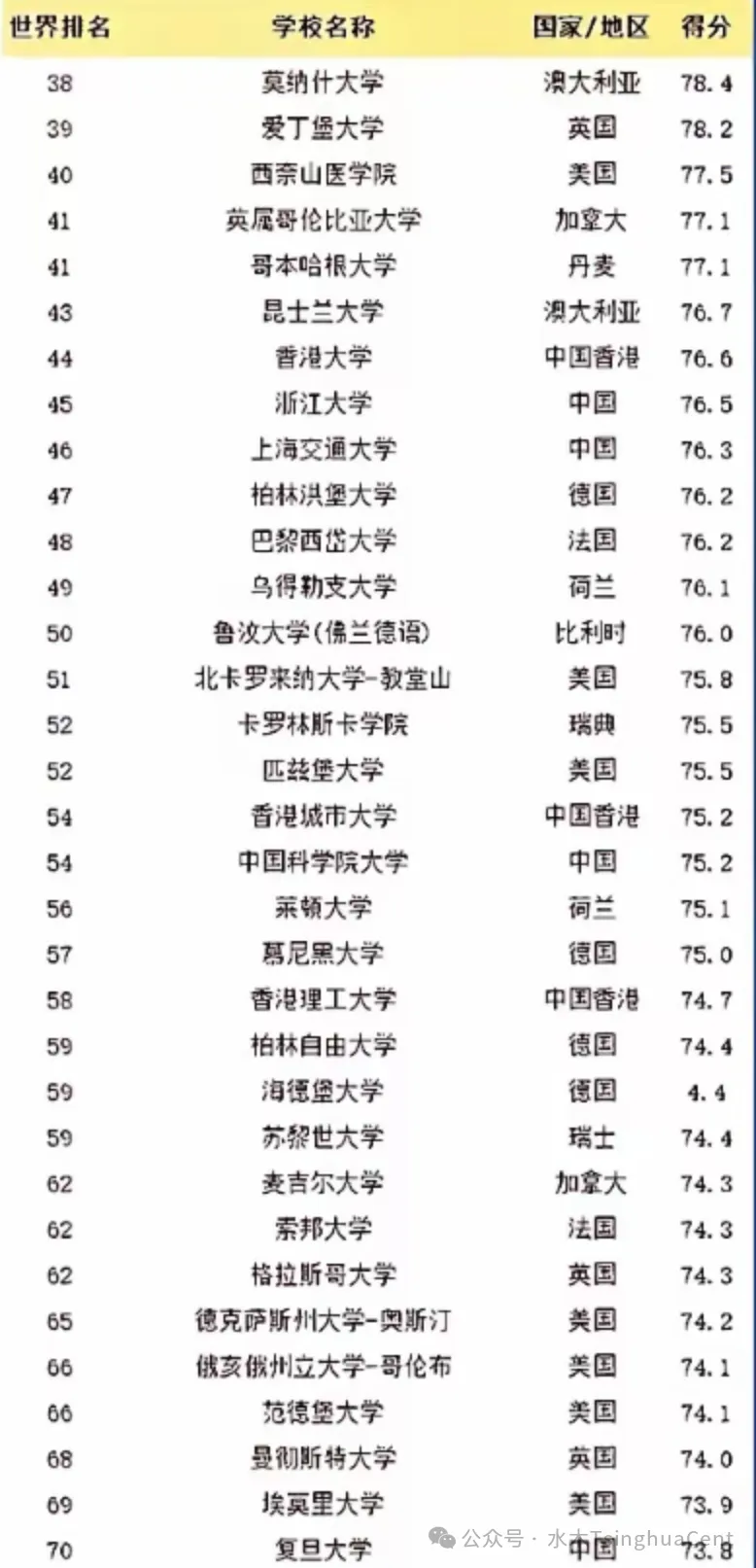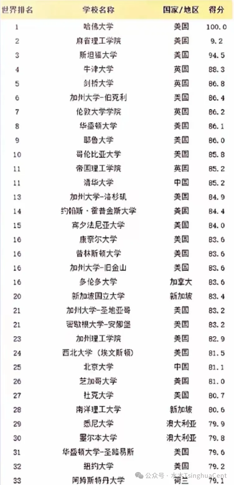排名靠前的几所中国大学:清华第11,北大第25,港大第44,浙大第45,上海交大第46,港城大和中科院大学并列第54,复旦第70。