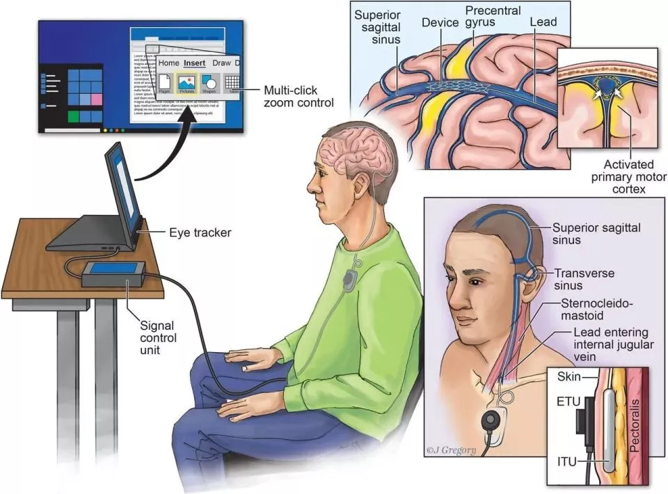 上图展示了渐冻症患者接受Stentrode植入后,身体内外的各个系统组件。可以看到,运动皮层处的毫米级Stentrode支架通过长长的导线连接了锁骨下方的皮下接收单元(ITU),该接收单元负责将信号传至体外的接收器(ETU)