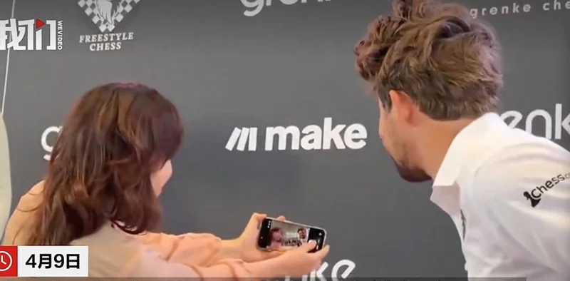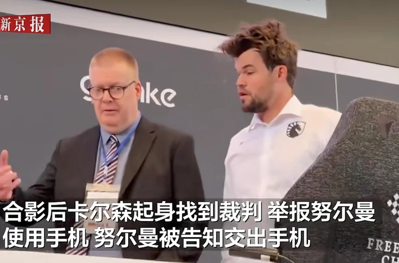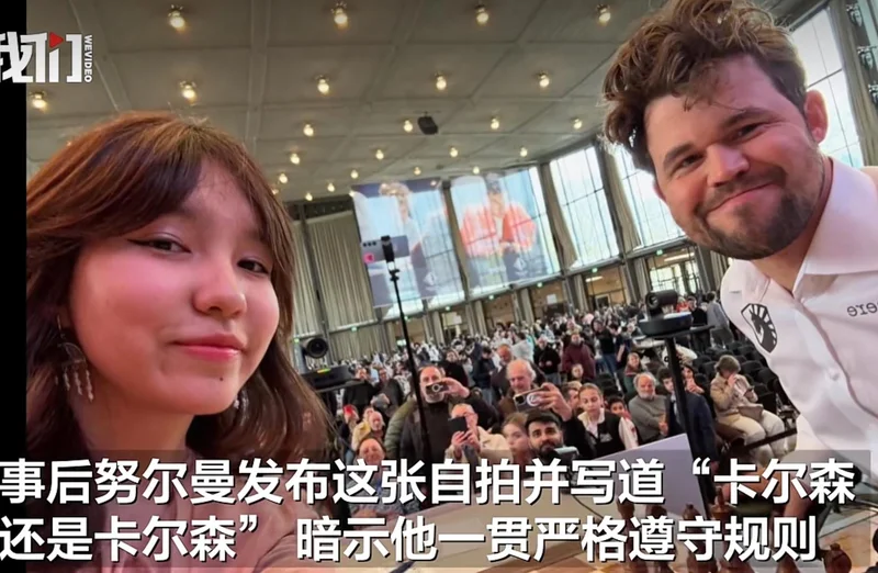 4月9日,挪威国际象棋大师比赛前笑着与女对手合影后,转身举报对方违规的视频引争议。 比赛4月2日在德国举行,18岁的哈萨克斯坦棋手努尔曼对阵世界排名第一的卡尔森,忍不住请求卡尔森合影,卡尔森欣然应允。 合影后,卡尔森起身找到裁判举报努尔曼使用手机,努尔曼被告知交出手机。卡尔森与略显尴尬的努尔曼握手并在比赛中战胜对方。事后努尔曼发布这张自拍并写道“卡尔森还是卡尔森”,暗示他一贯严格遵守规则。