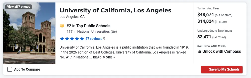 从更广阔的全国视角来看,加州“公立双雄”已然突破了公立校的范畴。UCLA目前在全美综合大学排名中高居第17位,与莱斯大学、范德堡大学等顶级私立名校并驾齐驱。虽然在公立排名中屈居次席,但其 9% 的录取率甚至低于 Berkeley 的 11%,反映出加州高等教育在全球范围内极高的认可度与竞争烈度。