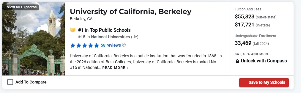 在此次评选中,UC Berkeley在毕业率、科研产出及师资资源等核心硬指标上表现卓越。在经历了 UCLA 此前长达七年的统治期后,Berkeley 的蝉联标志着学术重心向北加州的重新回归。作为湾区的核心学府,它不仅代表了教育的高度,更是湾区吸引全球顶尖人才的核心竞争力所在。