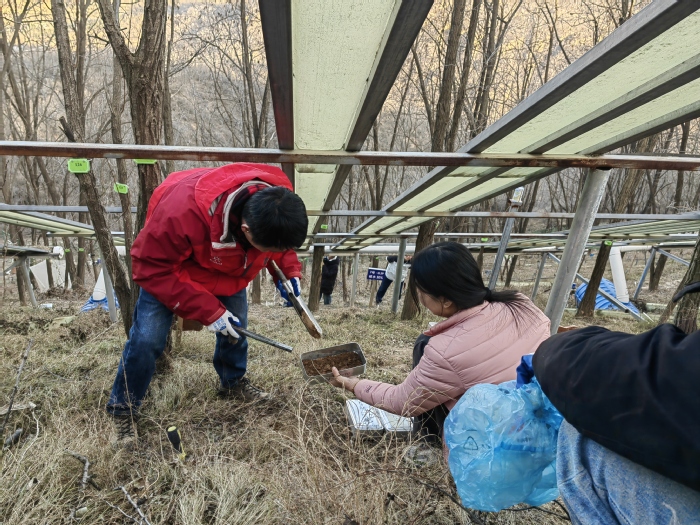 因为遮阳板只有半米高,在这里工作只能半蹲着行走。张萍萍的羽绒服和手套沾满了泥土,她却毫不在意,专注地装土、编号、记录。同时,不忘提醒同事,“今天要抓紧时间打钻,赶太阳落山前得把这66个饭盒的土样带回窑洞。”