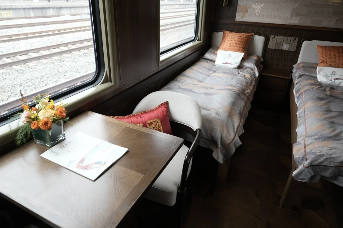 列车在硬件设施与服务保障上,进行了全方位的舒适化、适老化升级,精准破解银发群体“出游难”痛点。步入车厢,包厢内装设计将东方传统文化内核与现代旅居生活相结合,餐车及多功能休闲车采用宋式美学意趣,极简自然,让旅客在旅途中不止于行,更归于心。