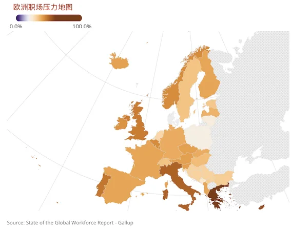 欧洲员工整体压力低于全球平均。相对而言,南欧人比北欧人的压力更高。压力最高的五个欧洲国家依次为:希腊(61%)、马耳他(57%)、塞浦路斯(56%)、意大利(51%)、西班牙(47%)。