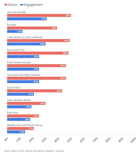 民调机构盖洛普发布的《2026年全球职场状态报告》呈现出鲜明的对比。欧洲职场压力较小,员工连续第六年霸占敬业度最低的地区,而美国和加拿大的员工敬业度最高,但同时压力也最大。