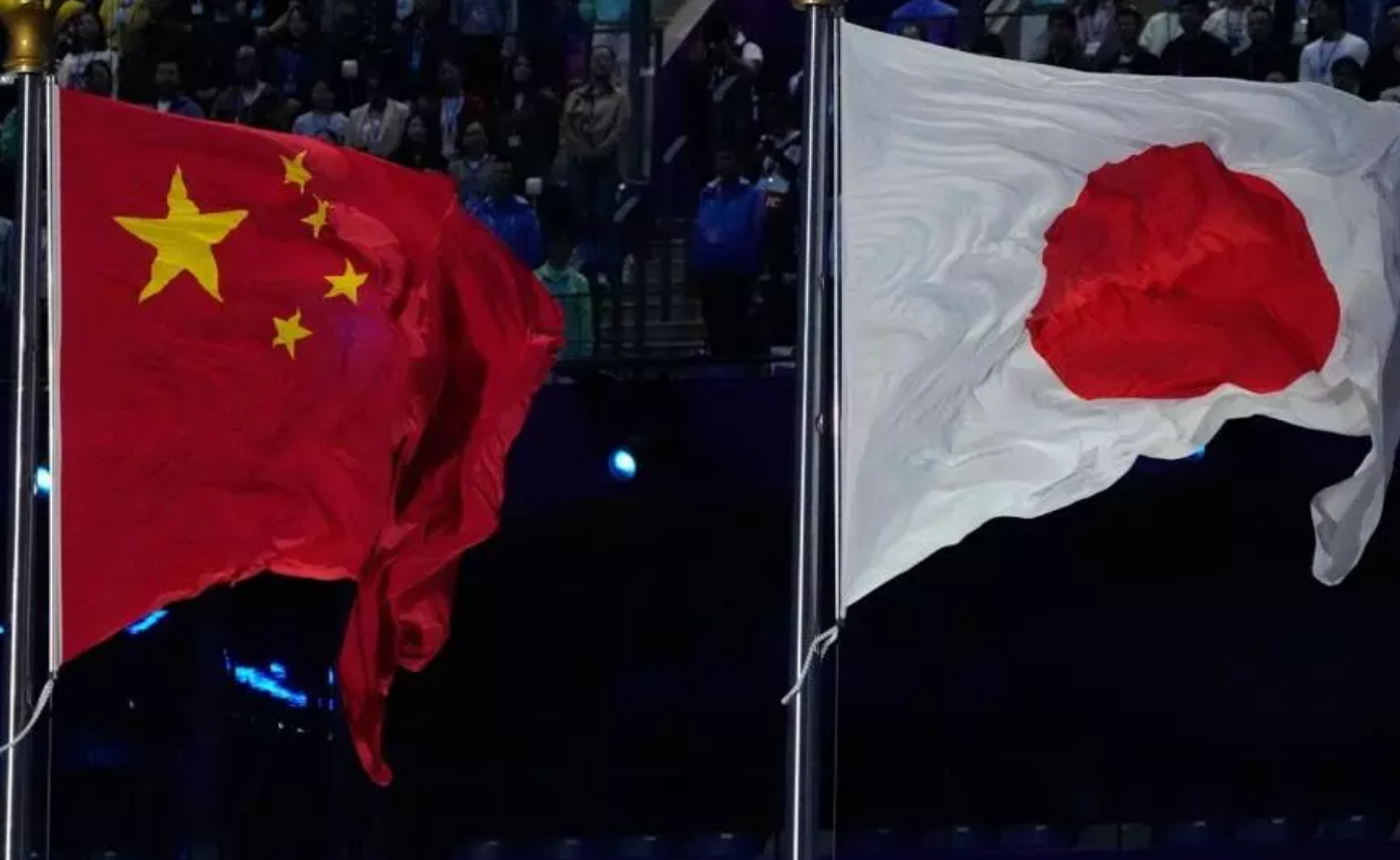 2023年10月8日,在杭州举行的亚运会闭幕式上,中国国旗和日本国旗并排飘扬。 AP - Eugene Hoshiko