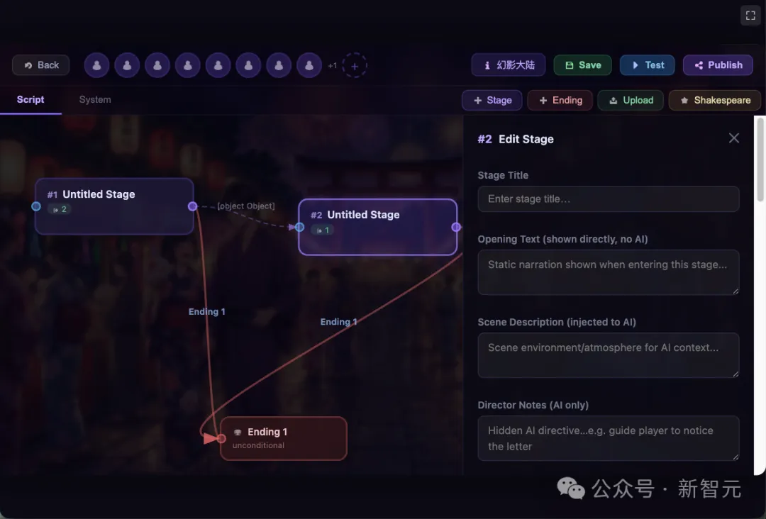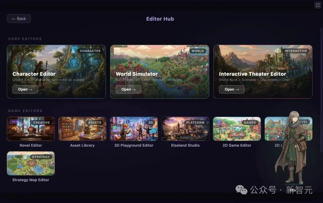 Elseland提供了不同的编辑器,包括角色编辑器、世界模拟器、互动剧场编辑器、2D小游戏编辑器,3D Studio,策略地图编辑器等,还有多Agent的协作工坊,完成更复杂的创作任务。