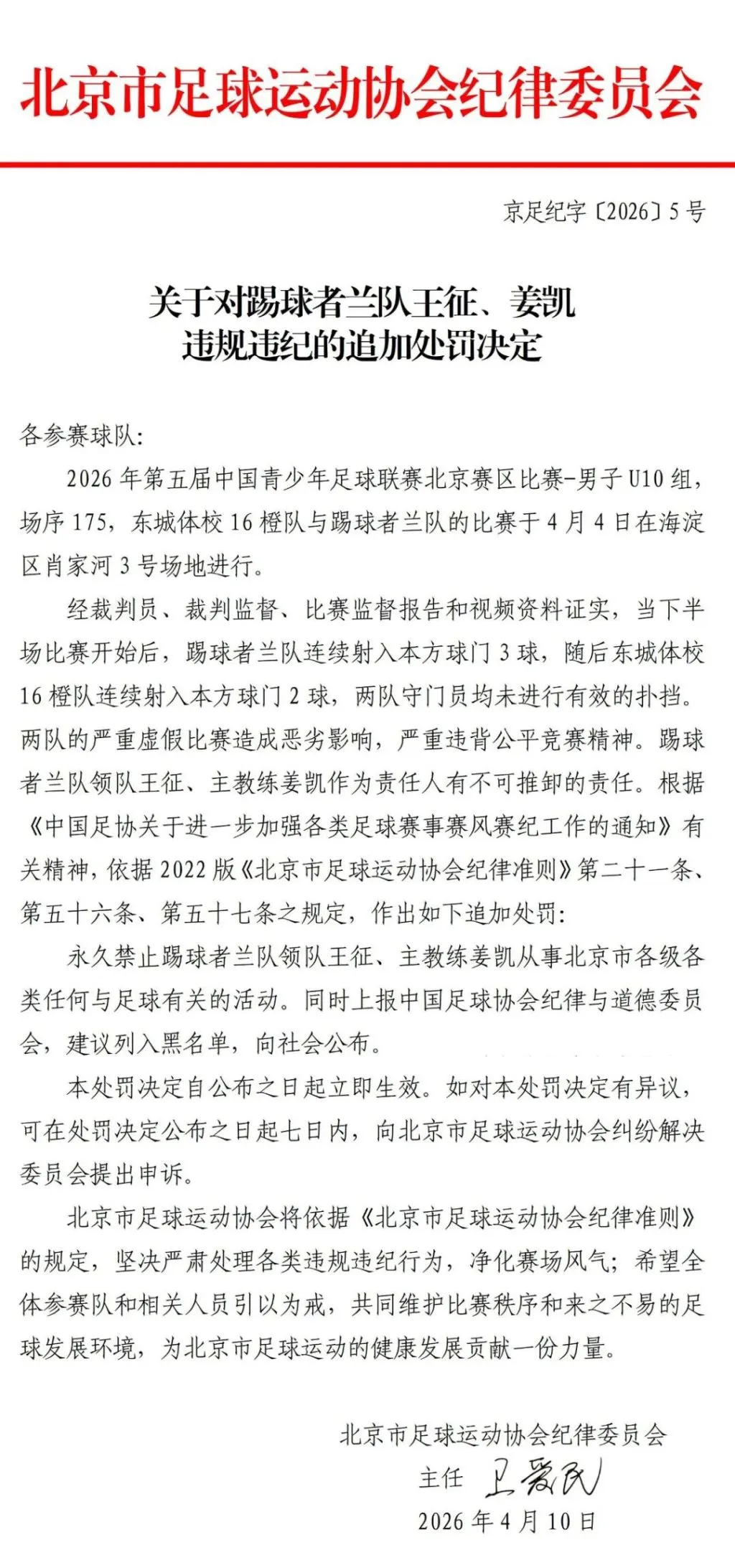 中国足协网站发布关于2026年第五届中国青少年足球联赛北京赛区男子U10组比赛发生严重虚假比赛情况的通报:
