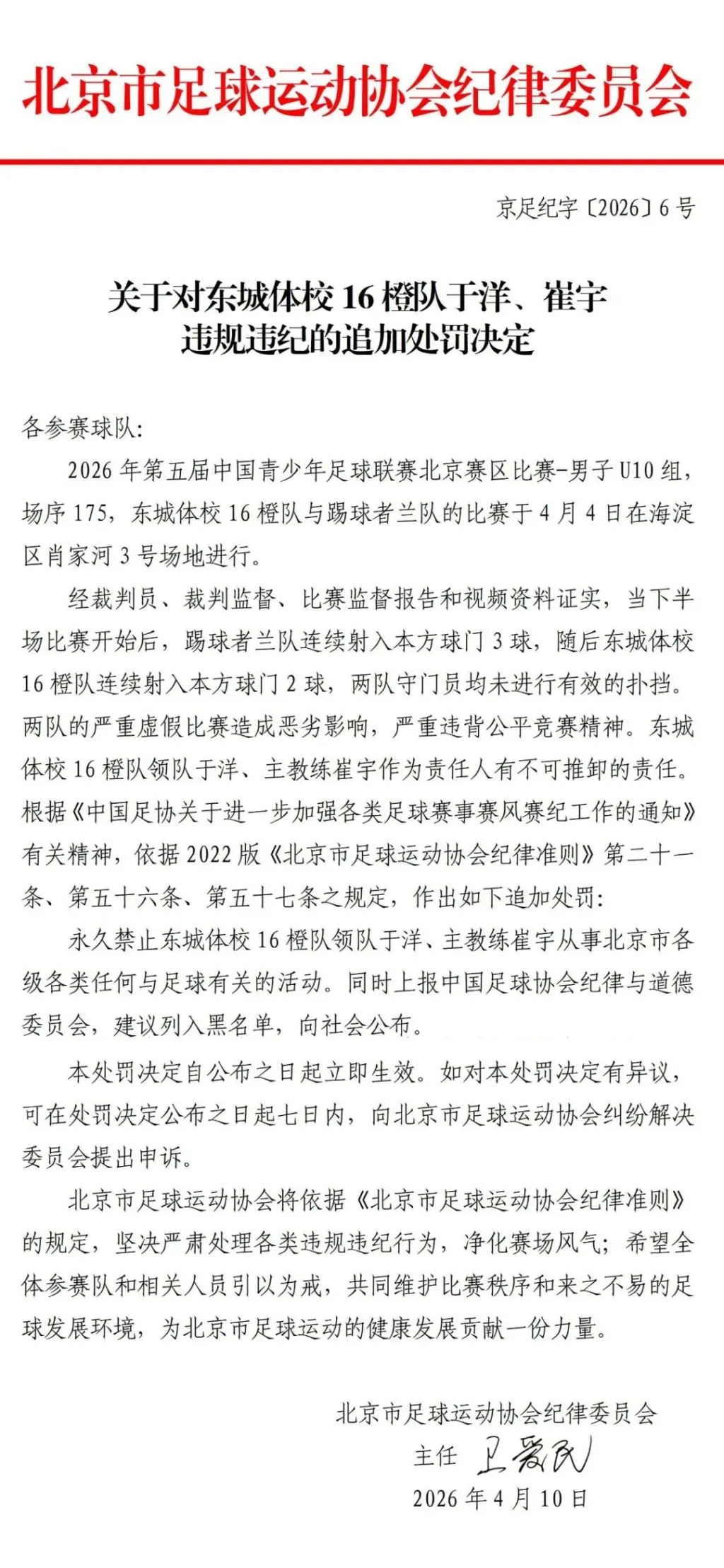北京市体育局网站4月10日消息,4月4日,在2026年第五届中国青少年足球联赛北京赛区男子U10组东城体校16橙队与踢球者兰队比赛中,发生严重虚假比赛情况。此次事件性质恶劣,扭曲青少年价值观,造成严重不良影响,北京市足协已对有关问题作出严肃查处。