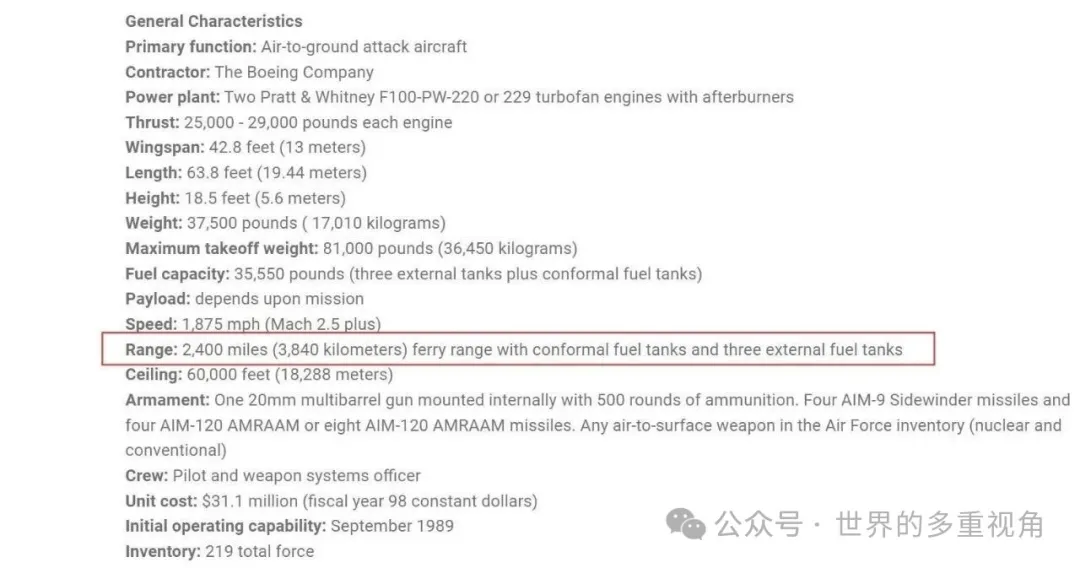 所以,波音官网里F-15E的3840公里转场航程,应该也是内油+副油箱的数据,比F-15C的3971公里要低一些(F-15E更重)。