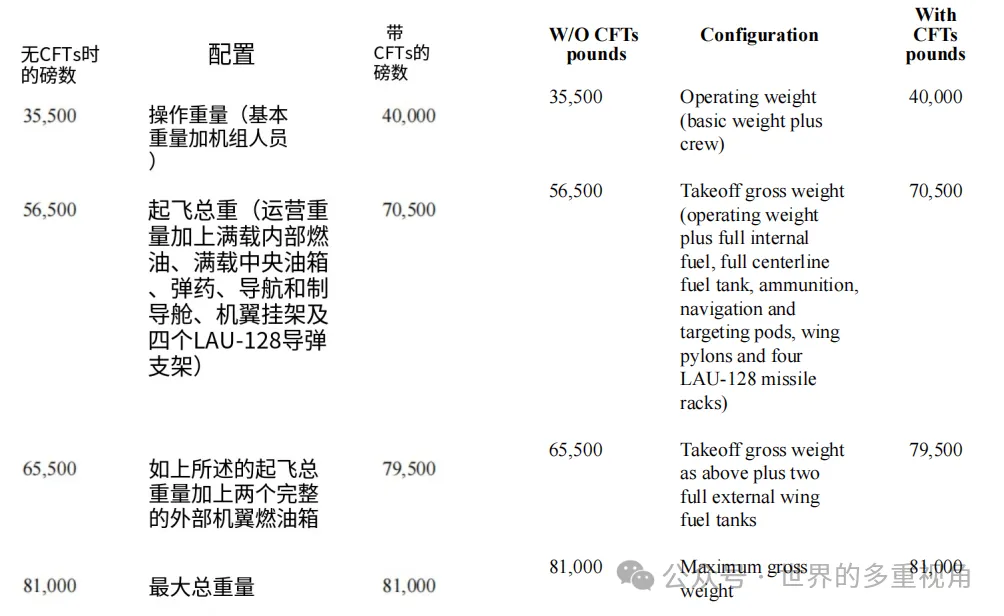 F-15E的不带CFT的使用空重是33500磅(15.2吨)带CFT的使用空重是37500磅(17.01吨)。