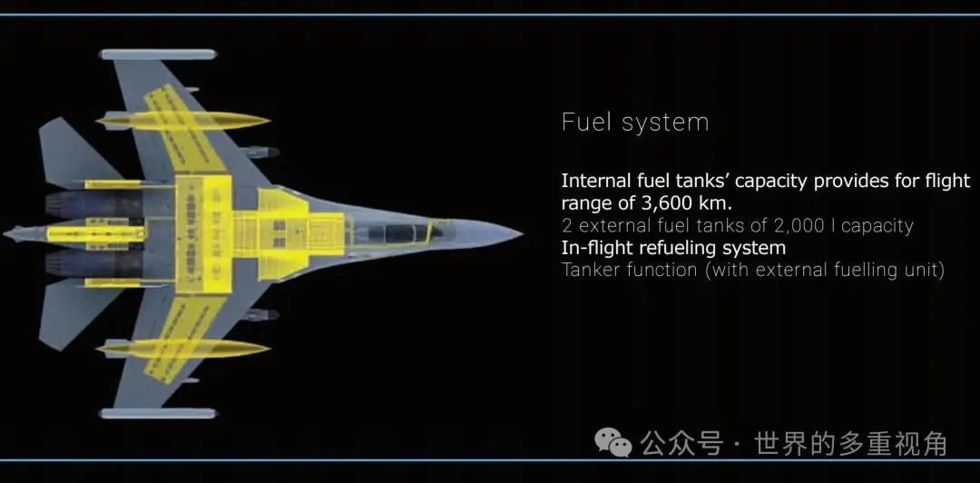 上图是宣传片里给的燃油分布示意图,可以看到苏-35的机身、主翼、后机身、垂尾内部都设计了油箱。
