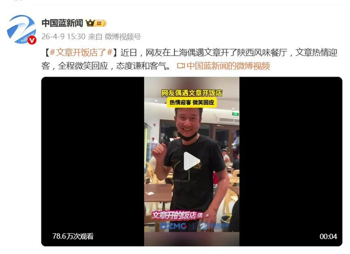 据4月9日报道,演员文章在上海低调开设的陕西风味餐厅被网友偶遇,其本人身穿店员服热情迎客、全程微笑攀谈的模样,迅速在网络上刷屏。这副谦和客气、毫无架子的姿态,与他早年留给公众的印象形成鲜明反差,引来一片“变了个人”的感慨。