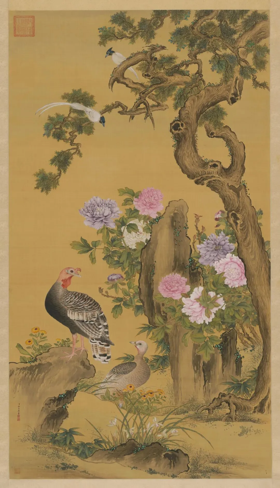 余省这老先生,乾隆朝的宫廷“画笔担当”,一出手就是《牡丹双绶图》这样的“王炸”。这画儿,绢本设色,尺寸大得像块电影幕布,往那儿一摆,富贵气儿直接拉满!