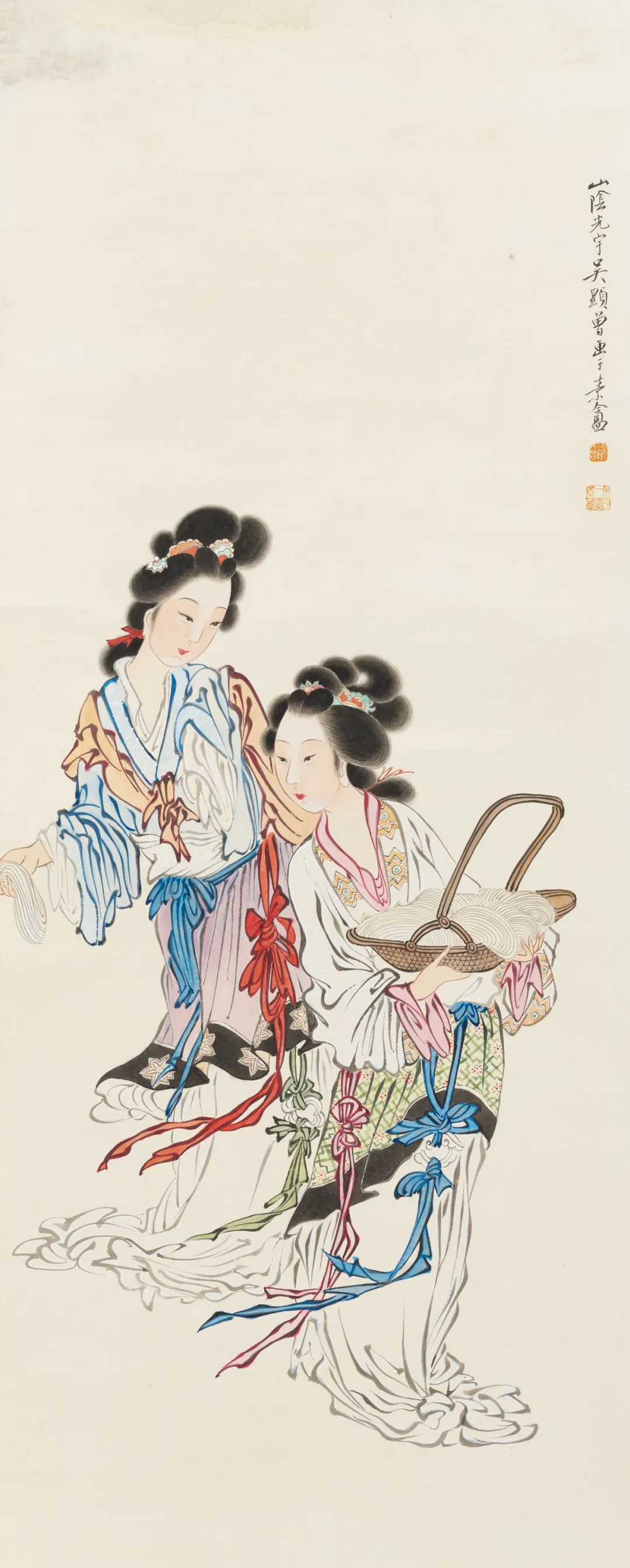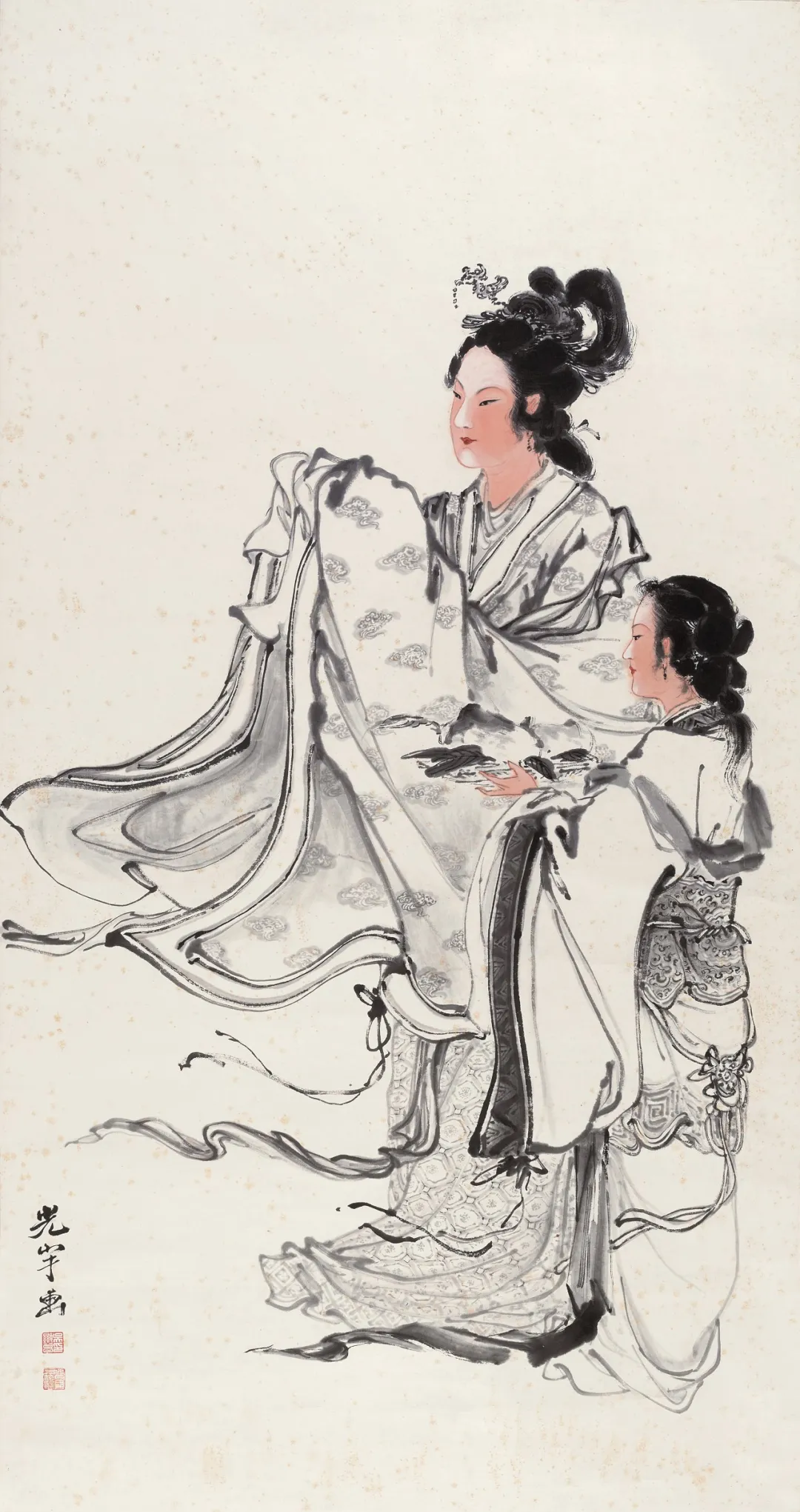 吴光宇的色彩,也讲究。他不像有些画家,颜色用得那叫一个“大胆”,直晃人眼。他偏爱淡雅,就像老戏台上的戏服,虽然不艳丽,但耐看,越看越有味道。仕女的衣裳,淡淡的粉,浅浅的蓝,跟她们的气质配得刚刚好。市井的场景,也是灰扑扑的墙,黄澄澄的土,看着就亲切,就像咱小时候住的老院子。