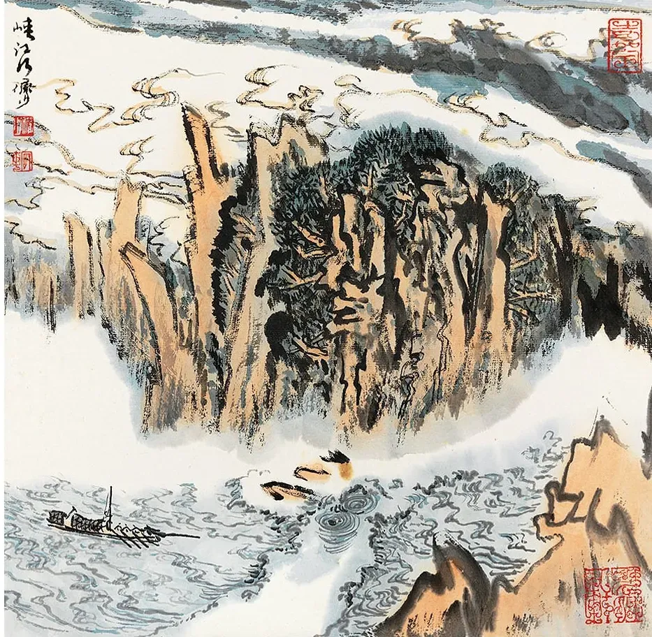 山峦起伏,林木葱郁,这哪是画啊,简直就是大自然的写真集!最让我佩服的是老先生的“峡江行”,峡江的险峻、水流的湍急,都被他画得淋漓尽致。看着这画,我仿佛都能听到江水奔腾的声音,感受到那股子冲劲儿。老先生画云,那叫一个绝!