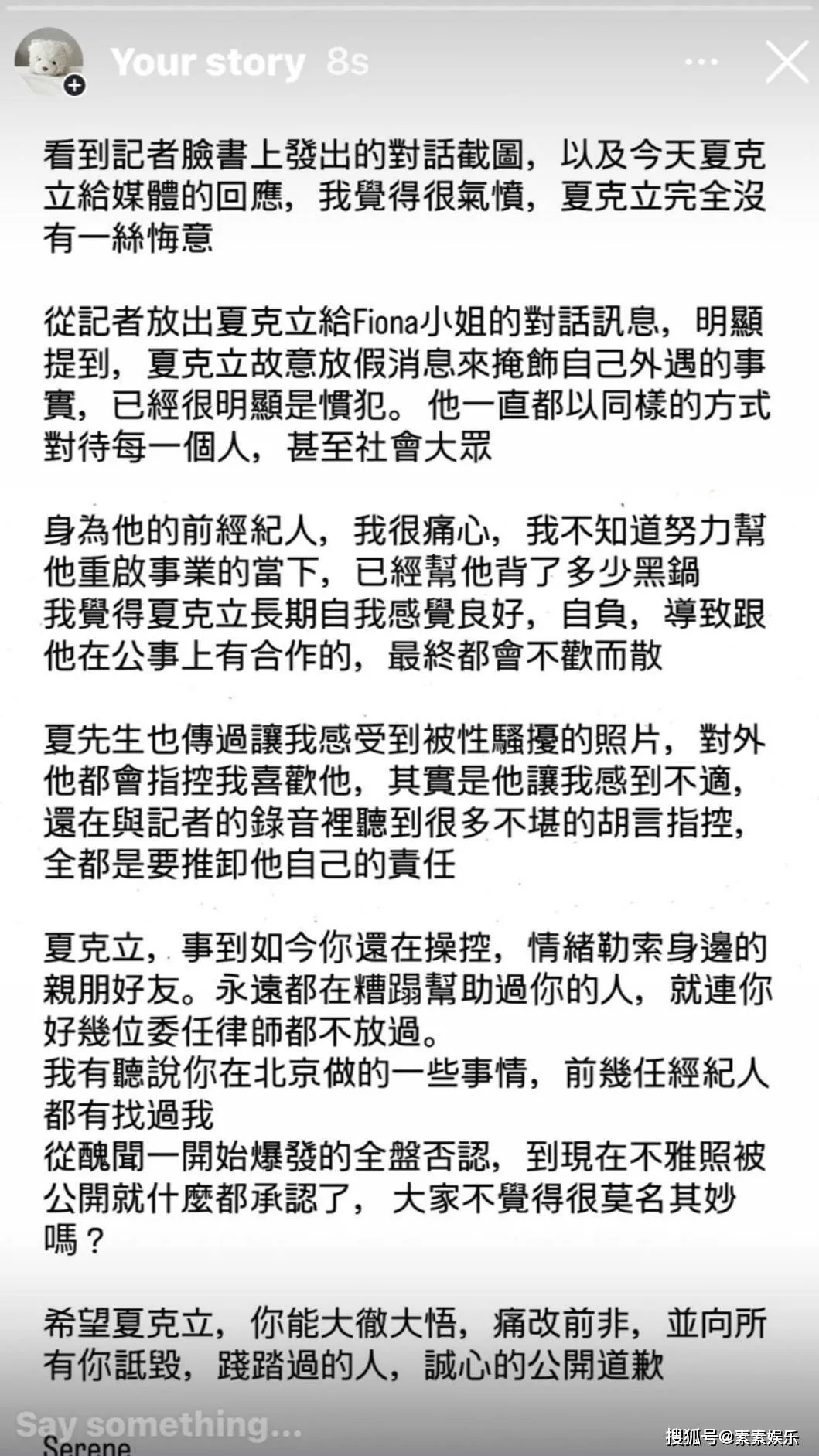 Serene发声:身为他的前经纪人,我很痛心,我不知道努力帮他重启事业的当下,也帮他背了很多黑锅。但是夏克立长期觉得自我良好自负,导致在事业上的合作最终不欢而散。