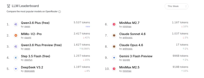 接着看数据,上周,中国AI大模型的周调用量直接干到了12.96万亿词元,你没看错,是万亿!这数据一出来,OpenRouter的排行榜都快成“中国专刊”了,前10名里,前6席全是国产模型,总调用量直接碾压。