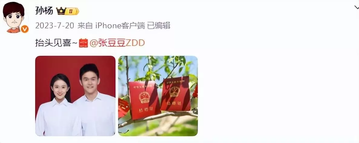 按照时间线来推测,孙杨在2023年的时候晒出结婚证,只有简单的“抬头见喜”四个字。