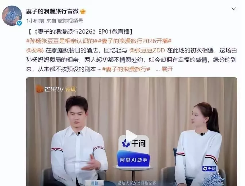 《妻子的浪漫旅行》简直快成“好消息”宣发地了。先是金莎、孙丞潇领证结婚,接着是马頔、李纯反向秀恩爱,就连孙杨和张豆豆也高调晒婚后生活了。
