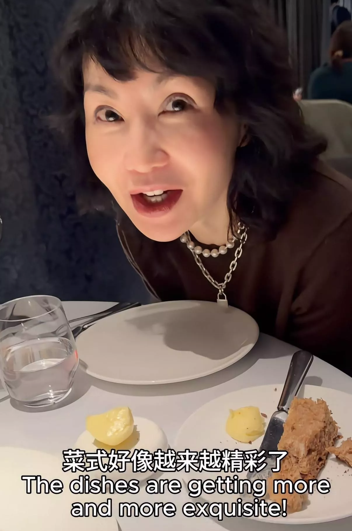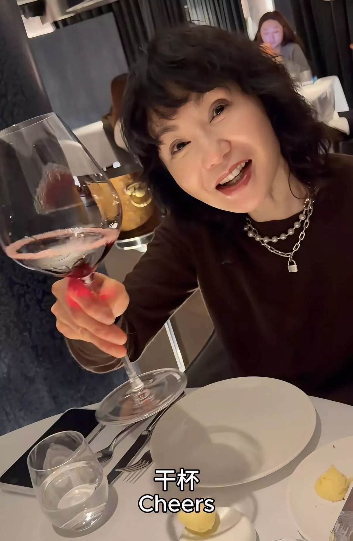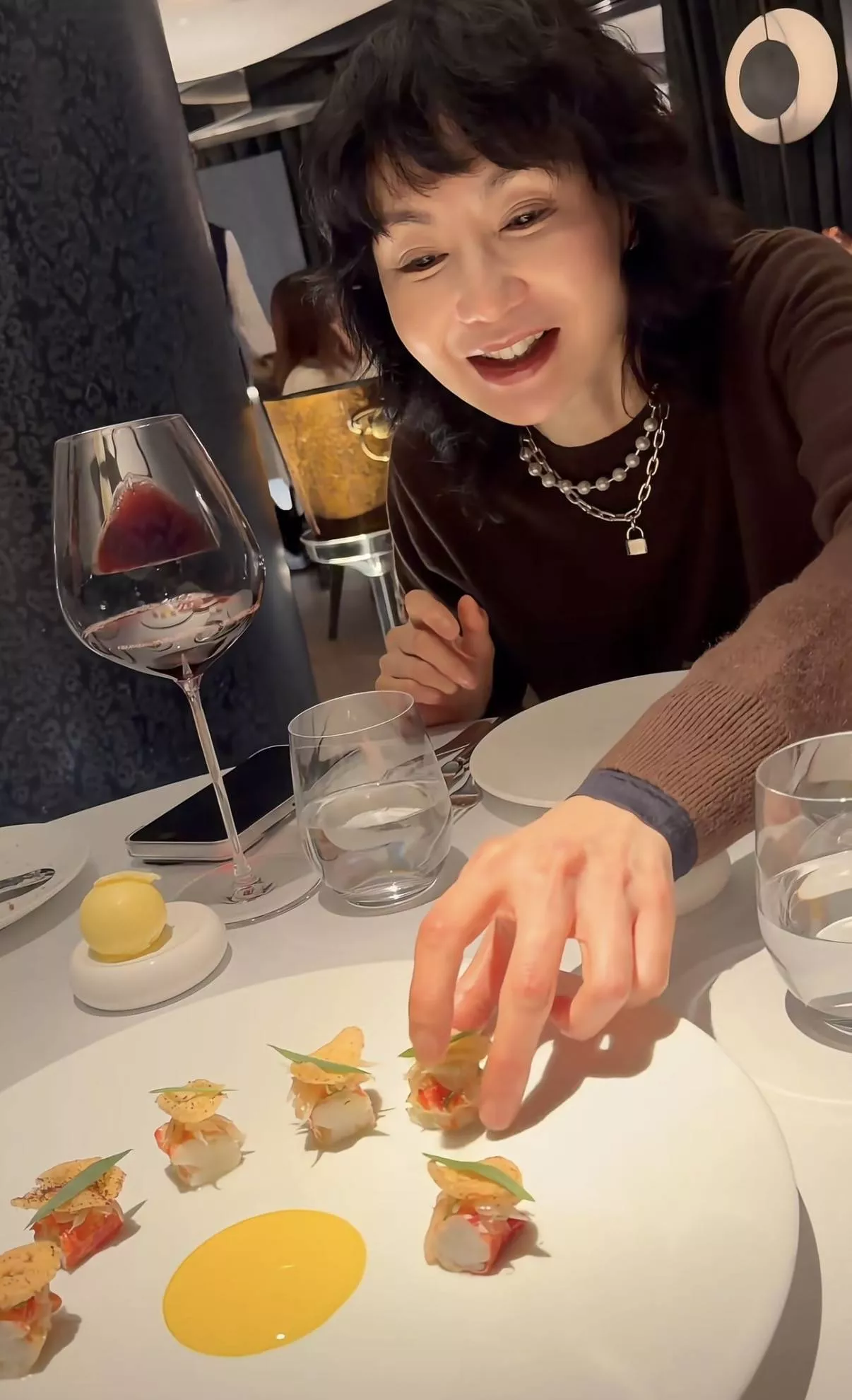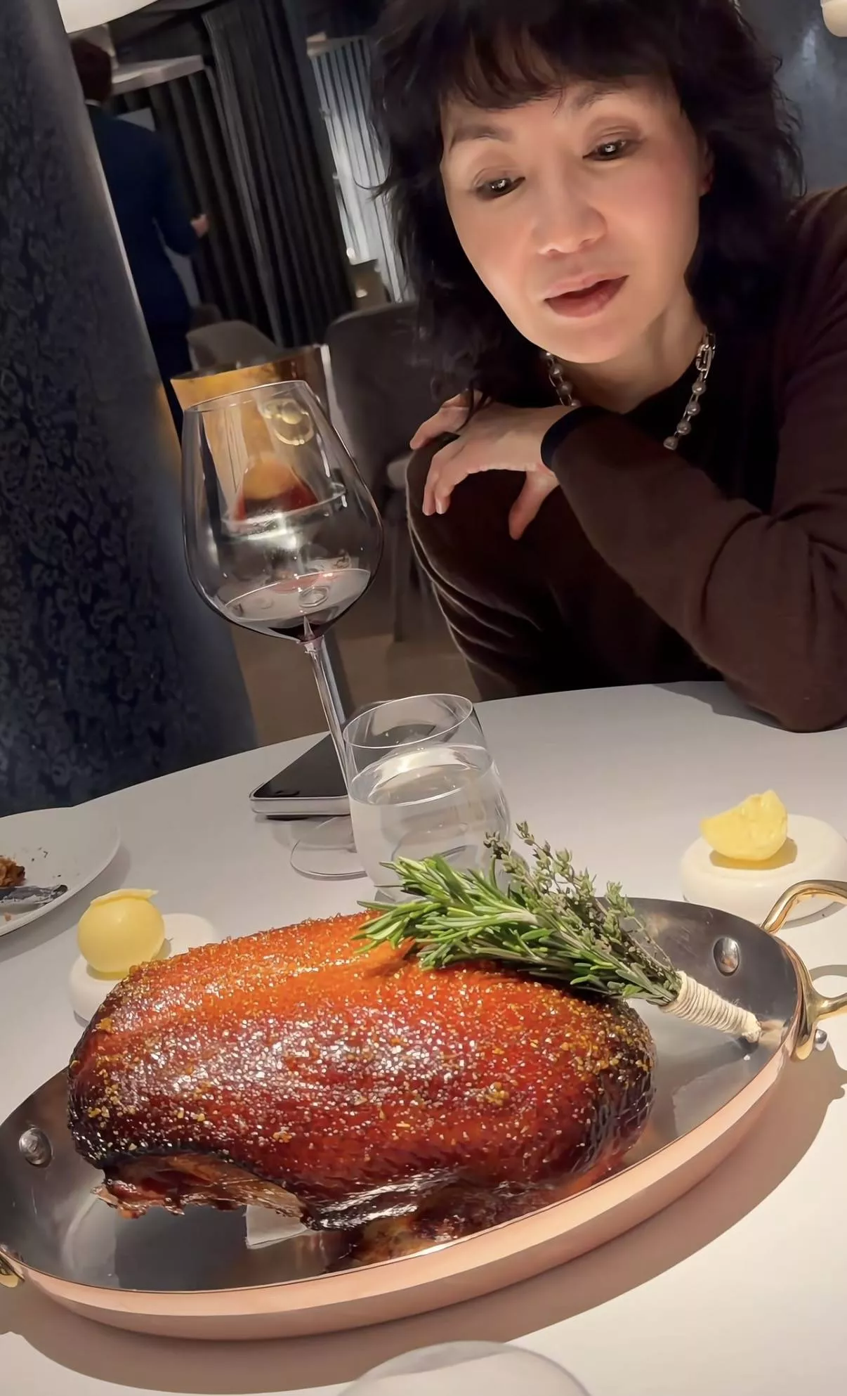 给朋友庆生,他们选择在米其林一星餐厅吃漂亮饭。张曼玉喝了红酒,还点了很多美食,有摆盘好看的蟹肉、还有龙虾、以及烤鸭、牛排、面包、甜品等等。