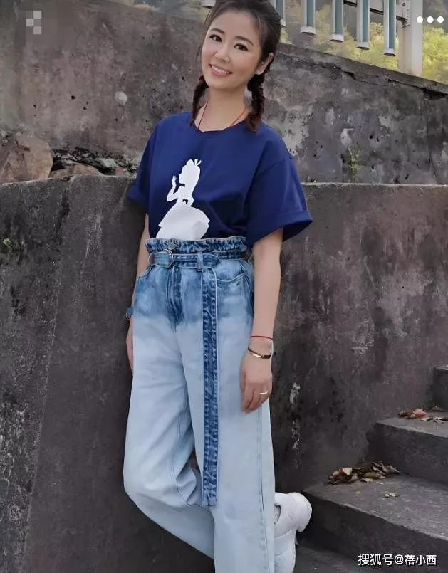 蓝色短袖在人群中很吸睛,圆领的设计简约又大方,衣身正面印着一个白色的卡通图案,给基础款T恤添了不少活泼感,避免了枯燥乏味。T恤衣摆塞进了裤腰,所以衣长是多少没有办法确定。头发编成了两条俏皮的麻花辫,发尾松松垮垮垂在肩头,额前留了点碎发修饰脸型,整个人看着减龄又元气,完全看不出年龄感。