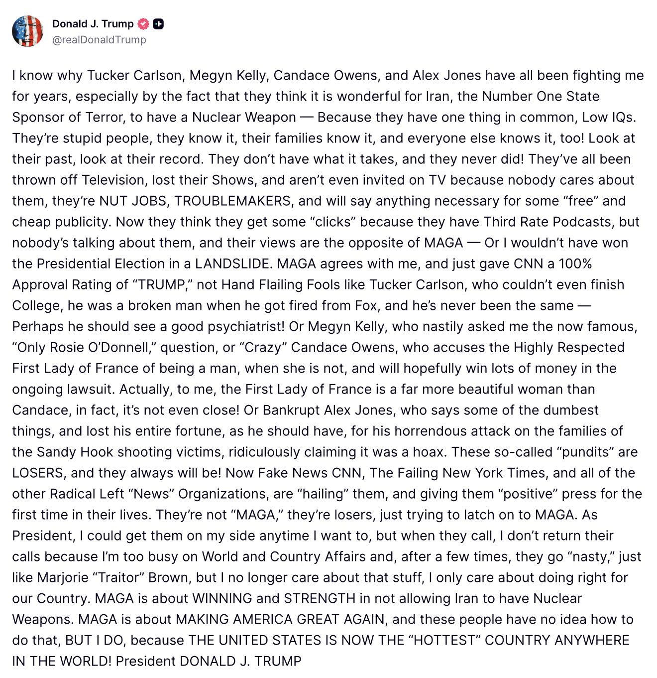 美国总统川普(Donald Trump)周五(10日)在旗下社群平台发文,直接开轰多名保守派、原MAGA意见领袖,包括转战自媒体的《福斯新闻》(Fox News)前主播、知名保守派政治评论员卡尔森(Tucker Carlson)、资深媒体人梅金凯莉(Megyn Kelly)、欧文斯(Candace Owens)与琼斯(Alex Jones),直指这些人「低智商」、「鲁蛇」。