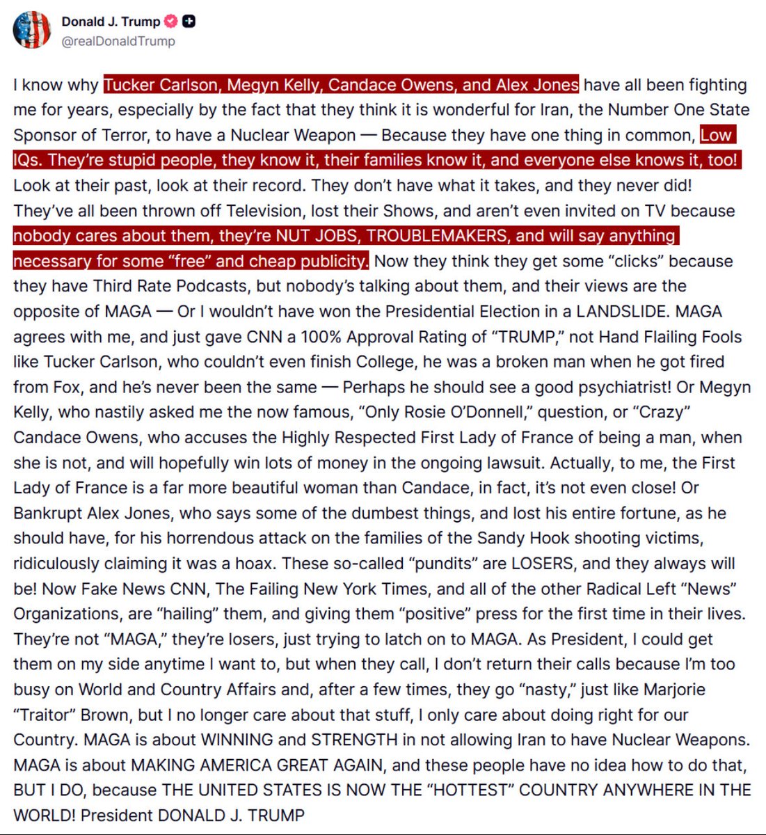川普点名批评的对象包括Tucker Carlson、Megyn Kelly、Candace Owens与AlexJones。他称这些批评者“认为伊朗拥有核武器是好事”,并指责他们“并非真正的MAGA支持者,只是想搭顺风车”。