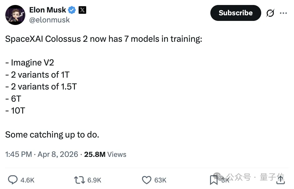 起因是老马发帖表示,xAI的Colossus 2超算正在训练7个模型,其中最大的一款,参数量直接冲到了10万亿。