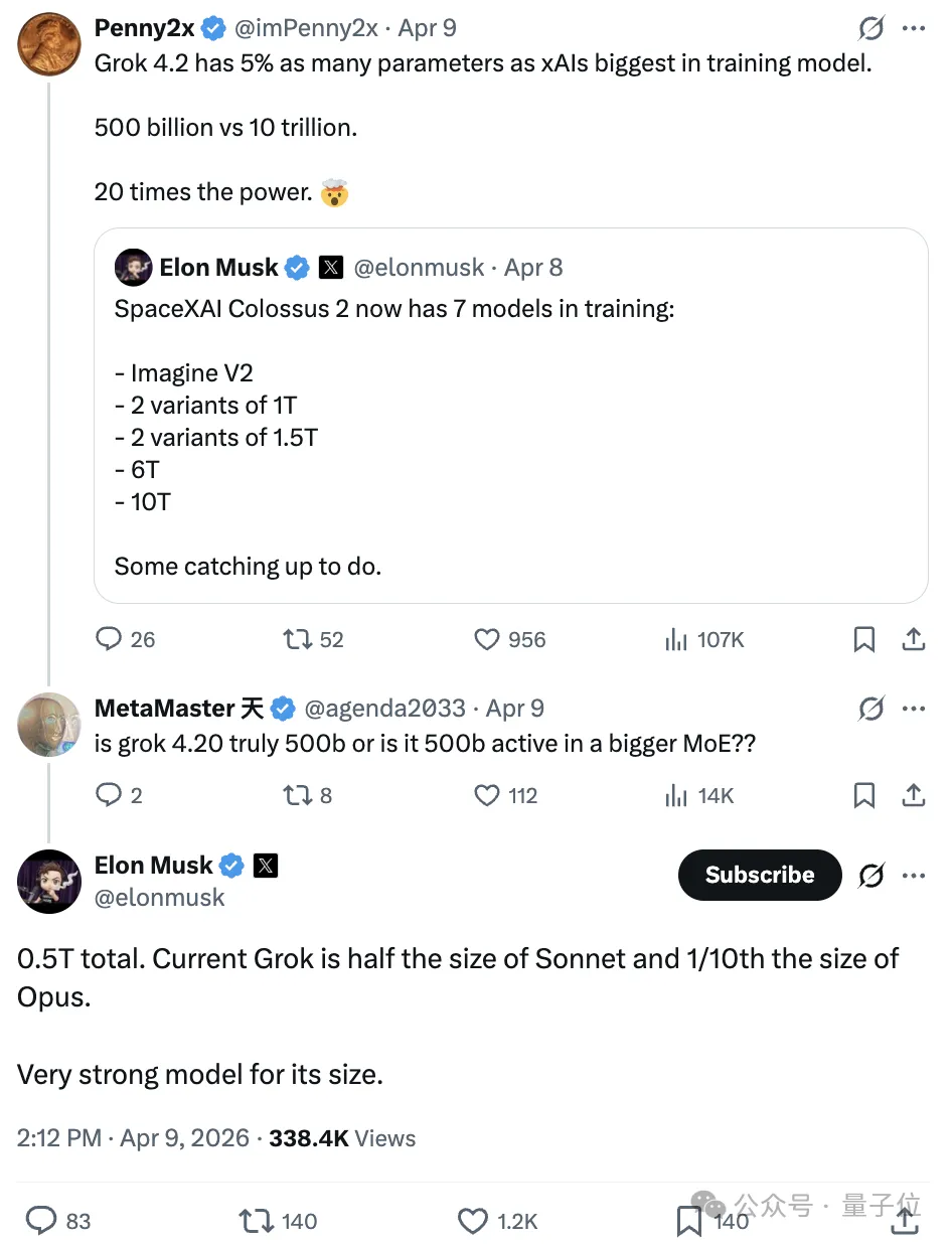 Grok 4.2真的是总参数量500B吗?还是说只是在一个更大的MoE里,激活的参数量是500B亿?