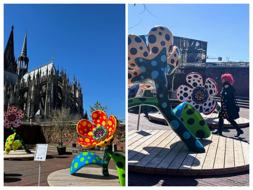 看到现场有很多人,都穿着波点来看展,致敬草间弥生。女儿和朋友在天台上拍到了一张,让我们都恍惚,以为是真人现身。