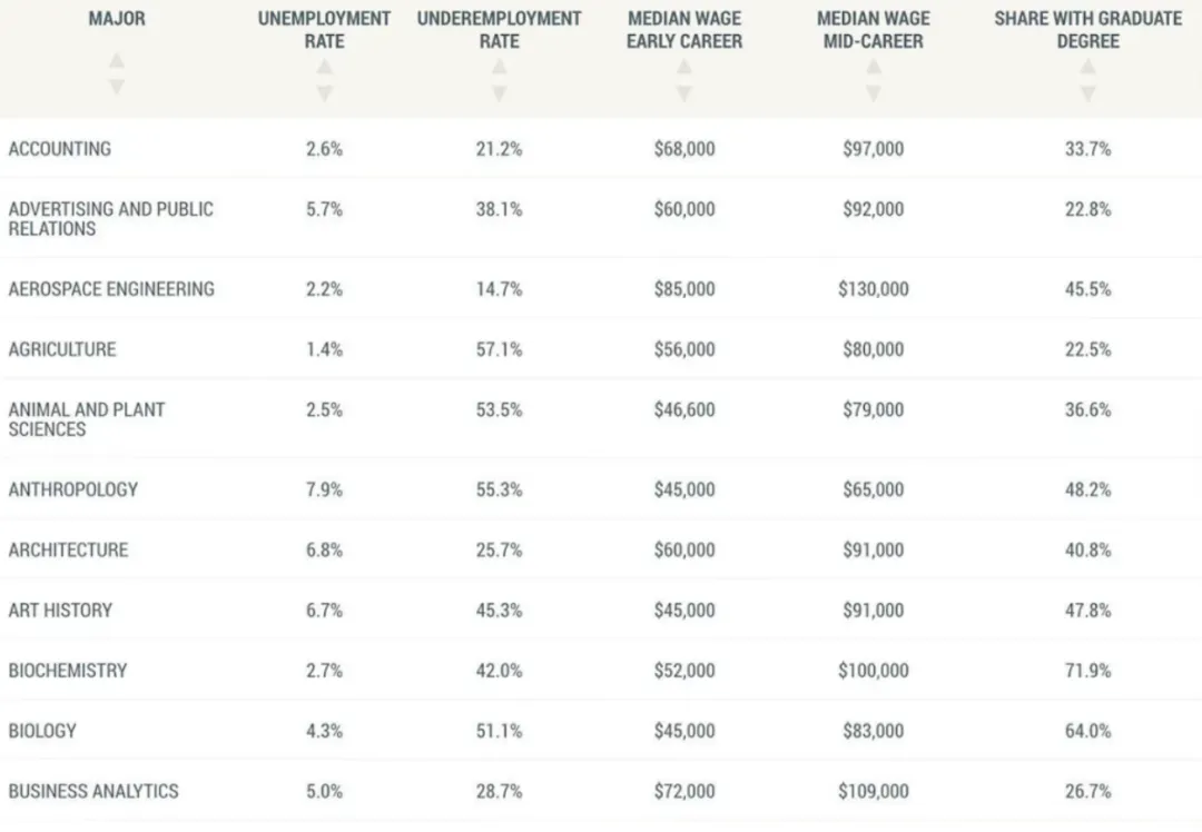 相比之下,人类学、美术、表演艺术等专业的就业不足率则超过了50%,这些专业的毕业生不仅求职困难,而且即便入职也很难将专业与职业期待相匹配,毕业后难以迅速在市场中站稳脚跟。