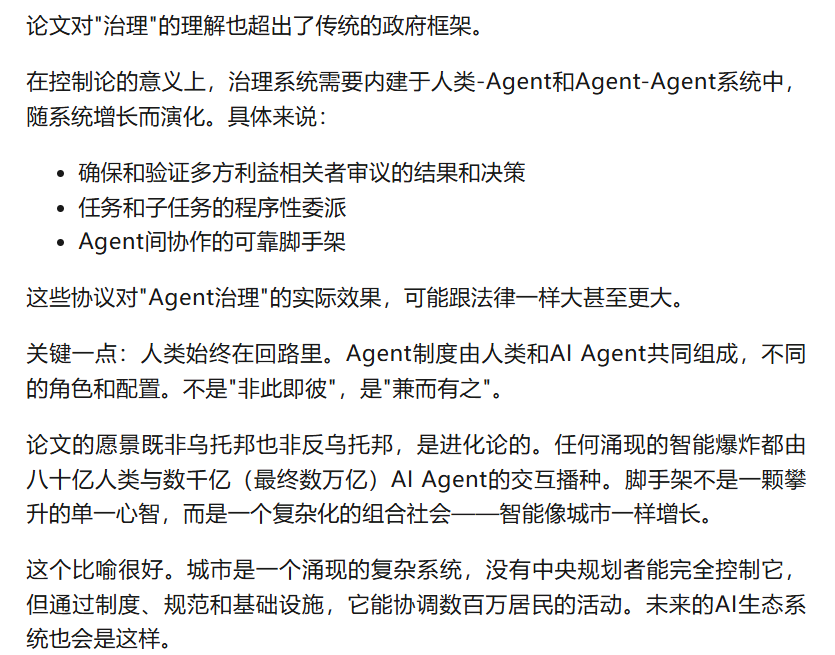 核心逻辑是:在人工 Agent 的世界里,没有任何单一智能集中点应该自我监管。权力必须制衡权力。美国开国元勋们早就懂这个道理,在人工 Agent 的世界里,需要以新的形式实现。
