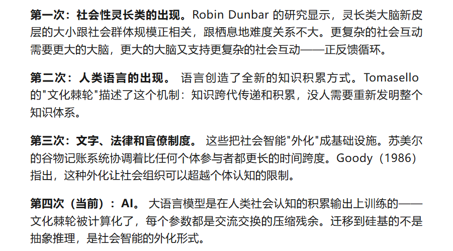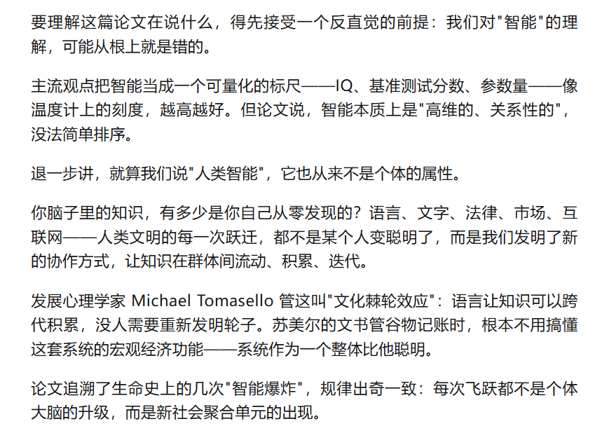 传统 “奇点” 叙事把即将到来的 AI 突破当成一个独特的、史无前例的事件。但论文指出,生命史上已经发生过好几次 “智能爆炸”,每次都不是个体认知能力的升级,而是新社会聚合单元的涌现。