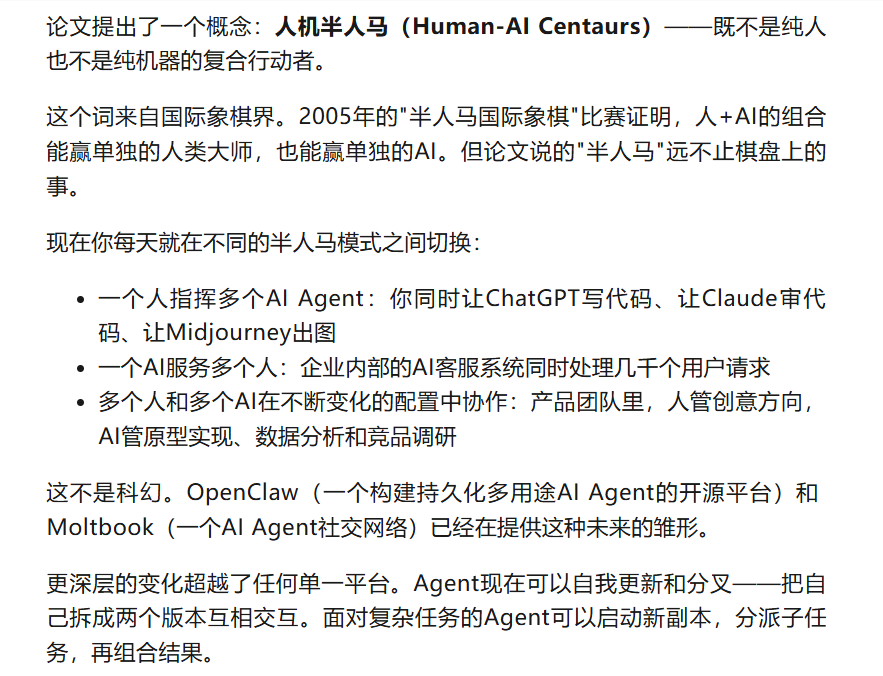 “智能爆炸已经在这里 —— 在每个推理模型内部辩论的思想社会中,在重塑每个知识职业的半人马工作流中,在开始大规模分叉和协作的递归 Agent 生态中,以及在我们现在必须开始提出的宪制问题中。问题不在于智能是否会变得更强大,而在于我们是否会建设出配得上它所正在成为的样子的社会基础设施。没有心智是一座孤岛。”