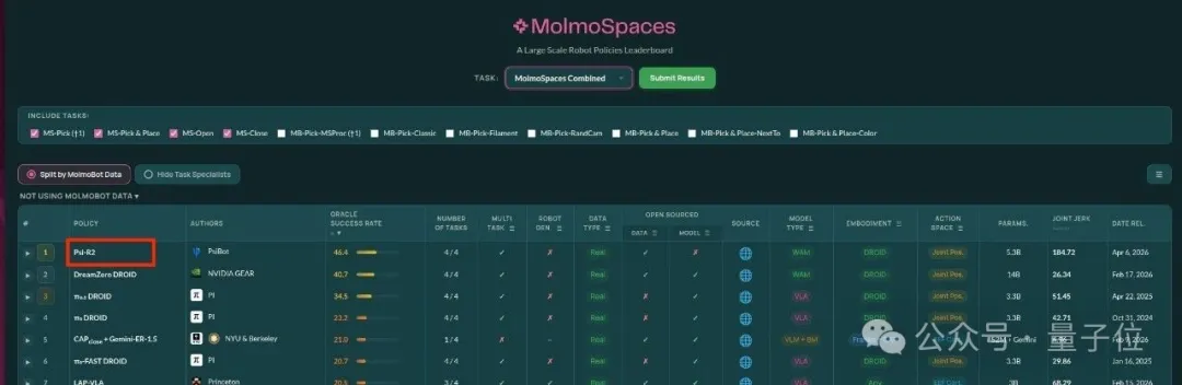 结果也很直观,灵初Psi-R2迅速登顶MolmoSpace榜单。