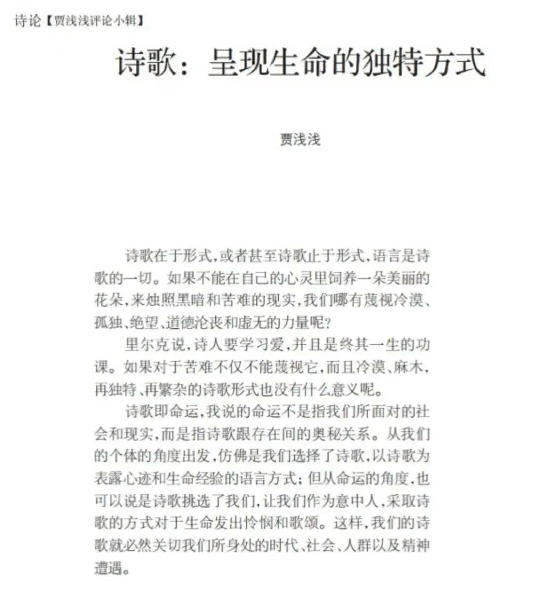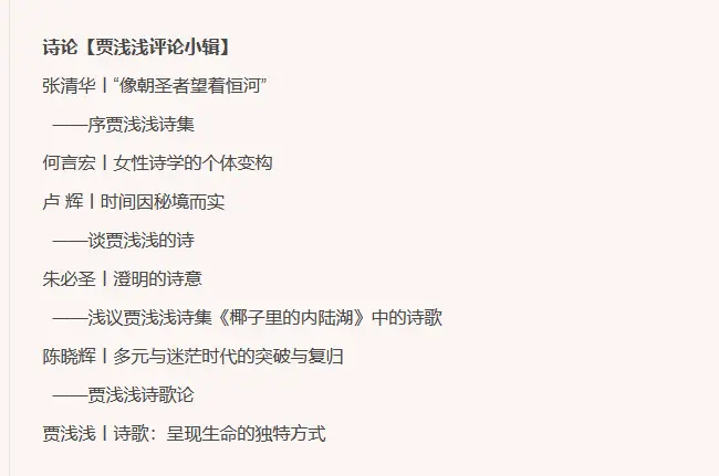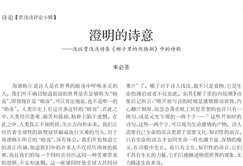 这期《文艺争鸣》杂志开设“贾浅浅评论小辑”,并集中刊载了五篇对贾浅浅诗歌的评论文章,朱必圣的文章是其中之一。