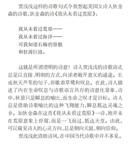 朱必圣在文章中称,贾浅浅的诗歌句式让他想起美国女诗人狄金森,“诗人贾浅浅的诗歌语式总是以直接、明朗的方式,向读者敞开意义的通途。贾浅浅此清朗诗风,在中国当代诗歌中并不多见。”