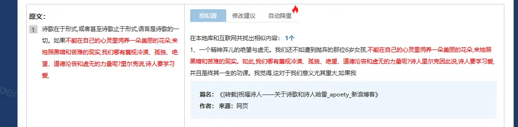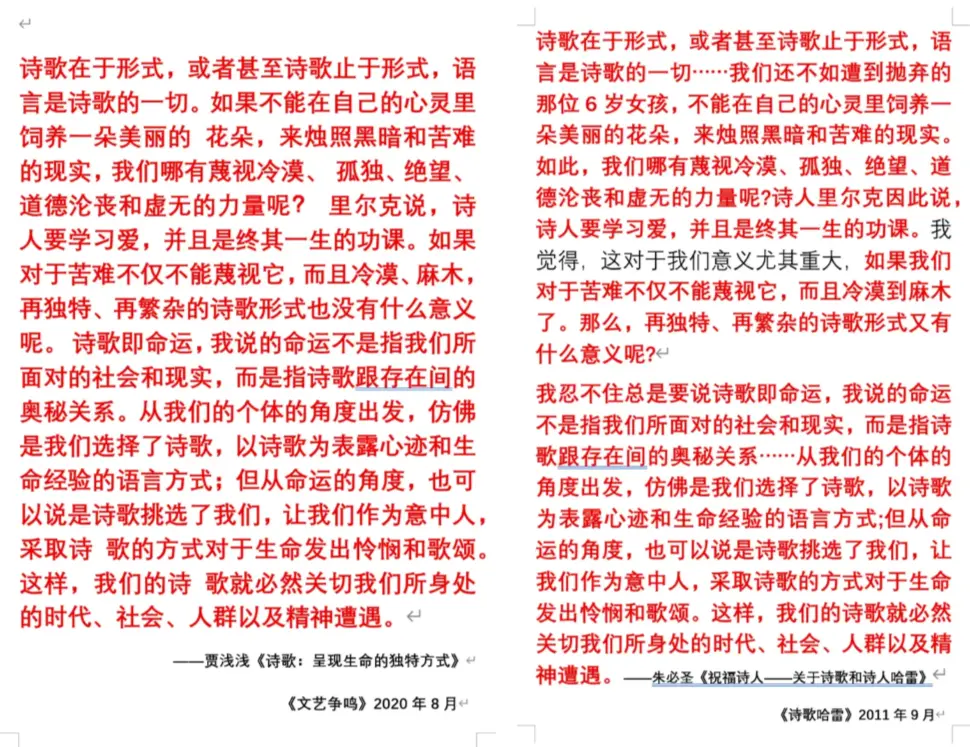 都市现场记者注意到,网友“抒情的森林”(以下简称“森林”)再次发出比对帖显示,贾浅浅2020年8月发表在核心期刊《文艺争鸣》的论文《诗歌:呈现生命的独特方式》,多个段落与朱必圣撰写的《祝福诗人——关于诗歌与诗人哈雷》以及诗人巴客的两篇文章高度雷同,部分语句一字未改。