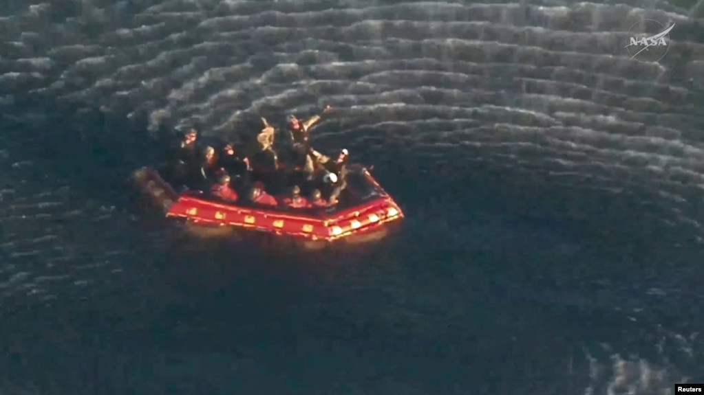 在太平洋上,宇航员克里斯蒂娜·科赫、杰里米·汉森、里德·怀斯曼和维克多·格洛弗被回收人员从“阿尔忒弥斯二号”任务的“猎户座”飞船中接出后,正等待被运送至回收船。(2026年4月10日)