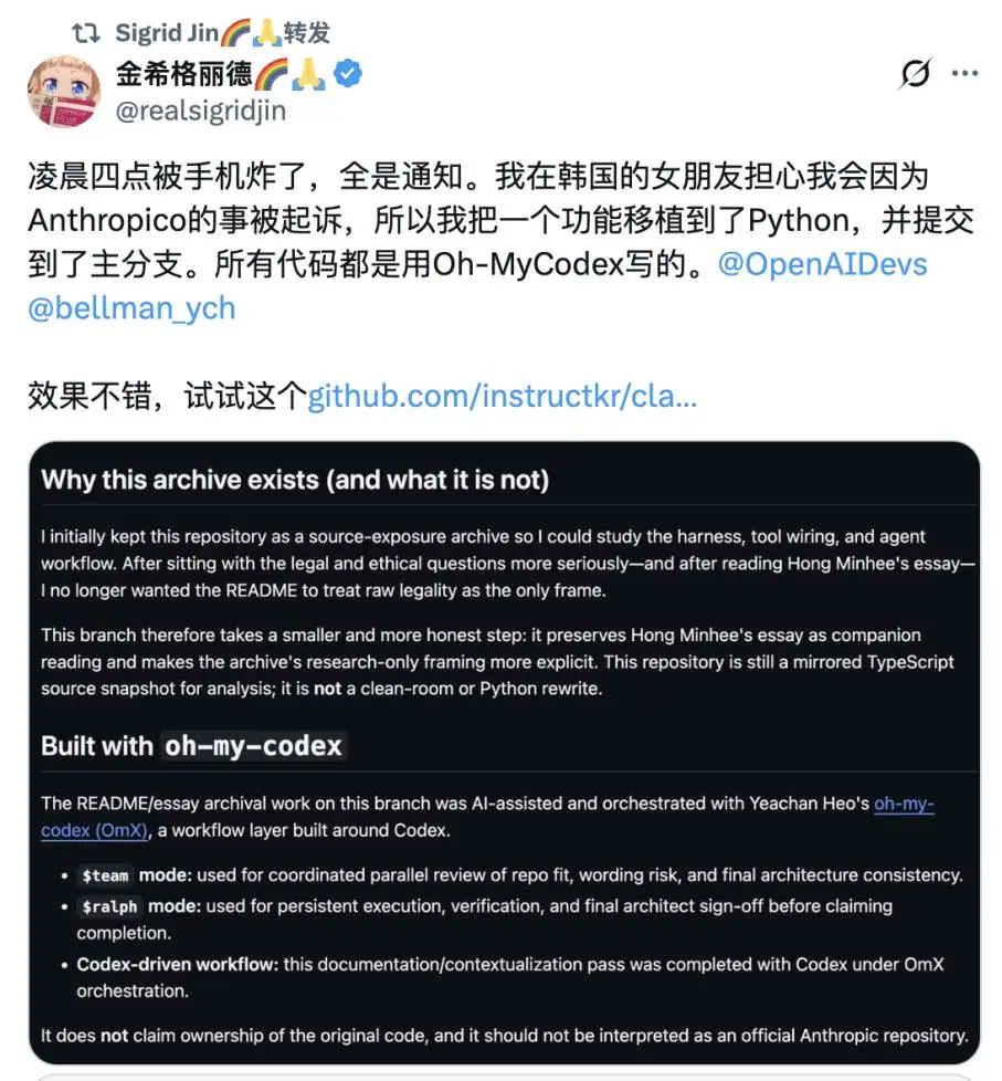 Sigrid Jin的消息列表炸了。他远在韩国的女朋友连珠炮似的给打电话,声音都在发抖。女友担心Sigrid Jin的电脑上存了那些代码,会有法律风险。Anthropic之前起诉过类似项目。