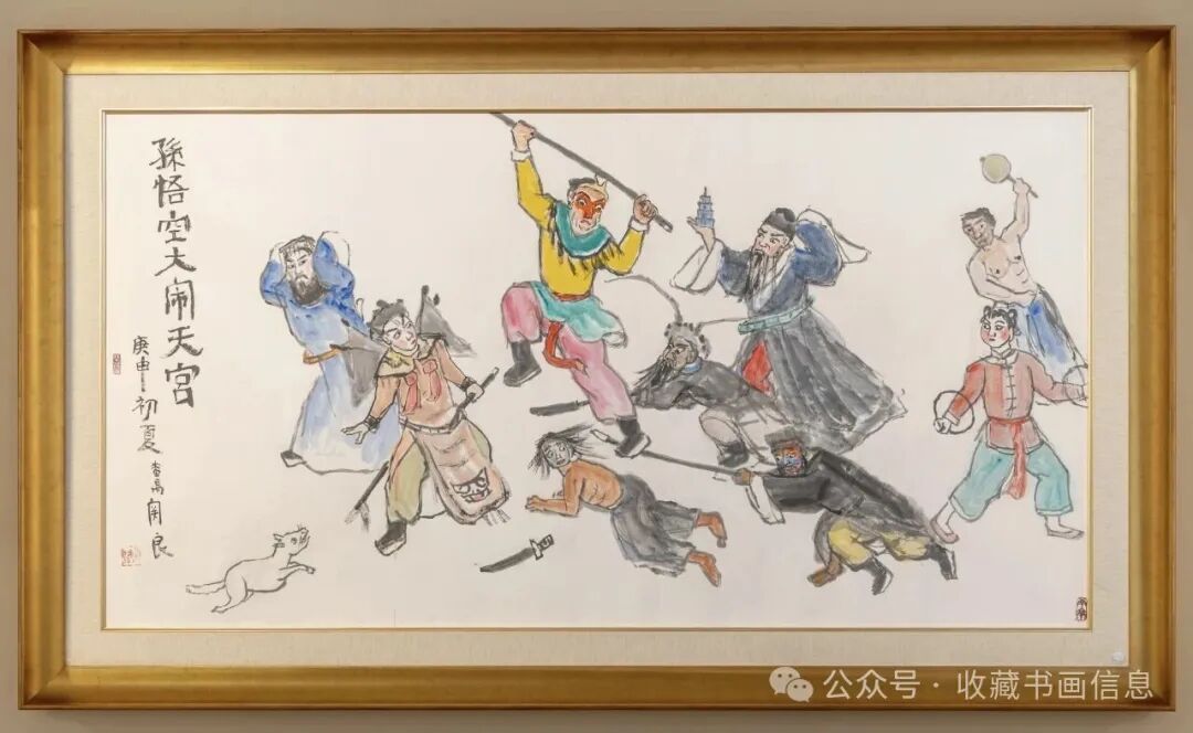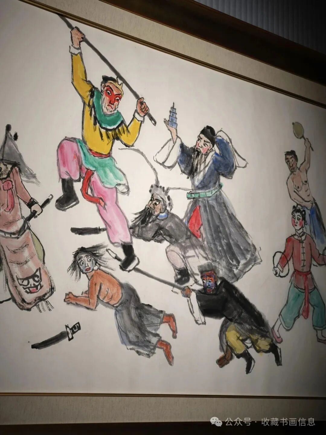 关良这幅《孙悟空大闹天宫》六尺整纸巨制,猴哥酣战众天将,九个角色大战,玉帝狼狈,大圣英武,用色古艳如油画,打稿修改痕迹都还在,妥妥的美术馆展览级的作品。