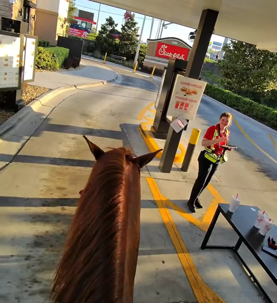 就在今年3月22日,佛罗里达男子Felipe Delamora就直接骑着一名叫Gitano的马,去Chick-fil-A得来速买饮料。