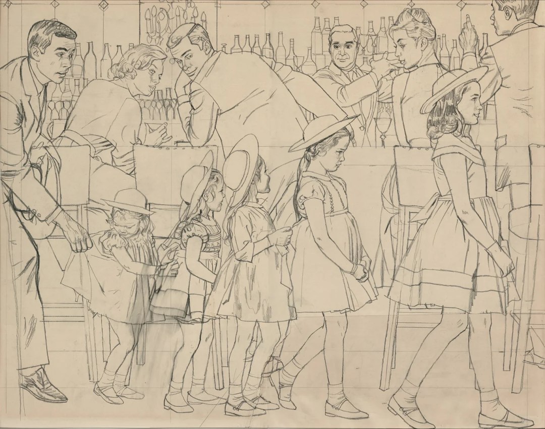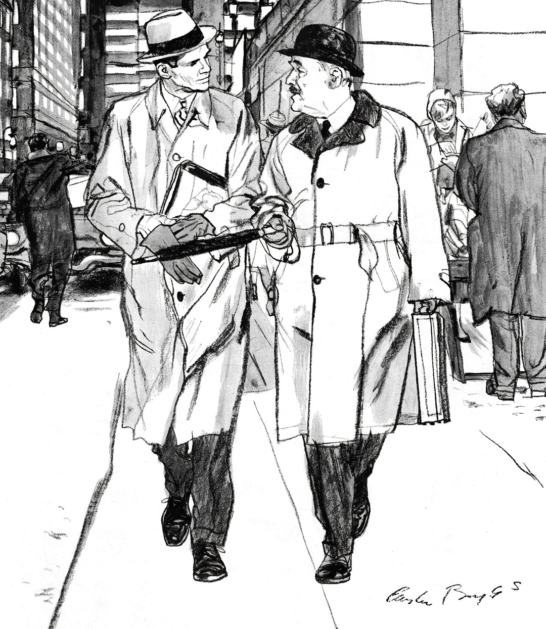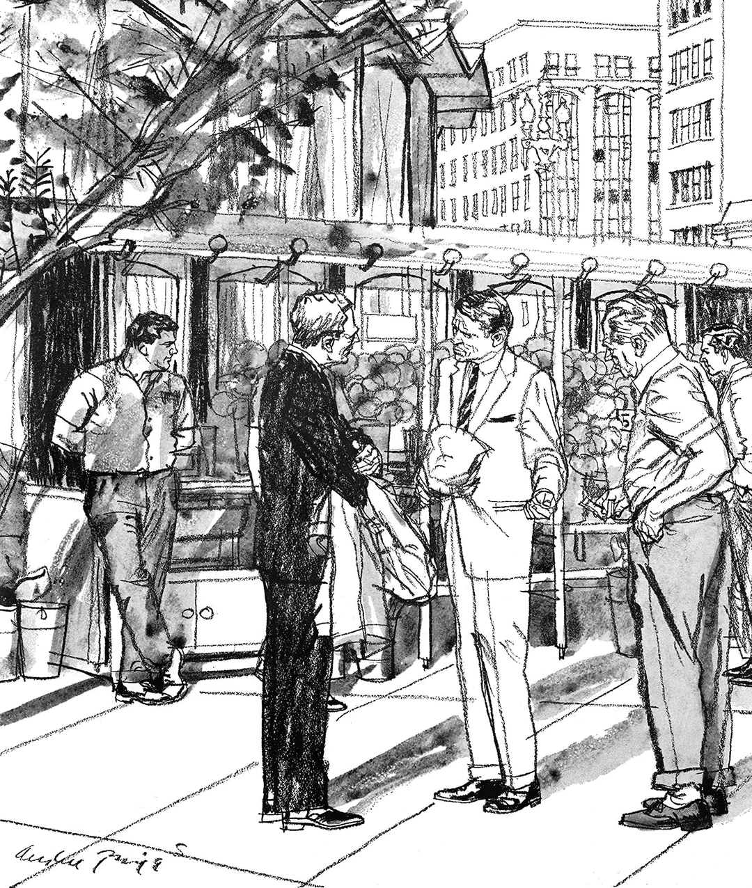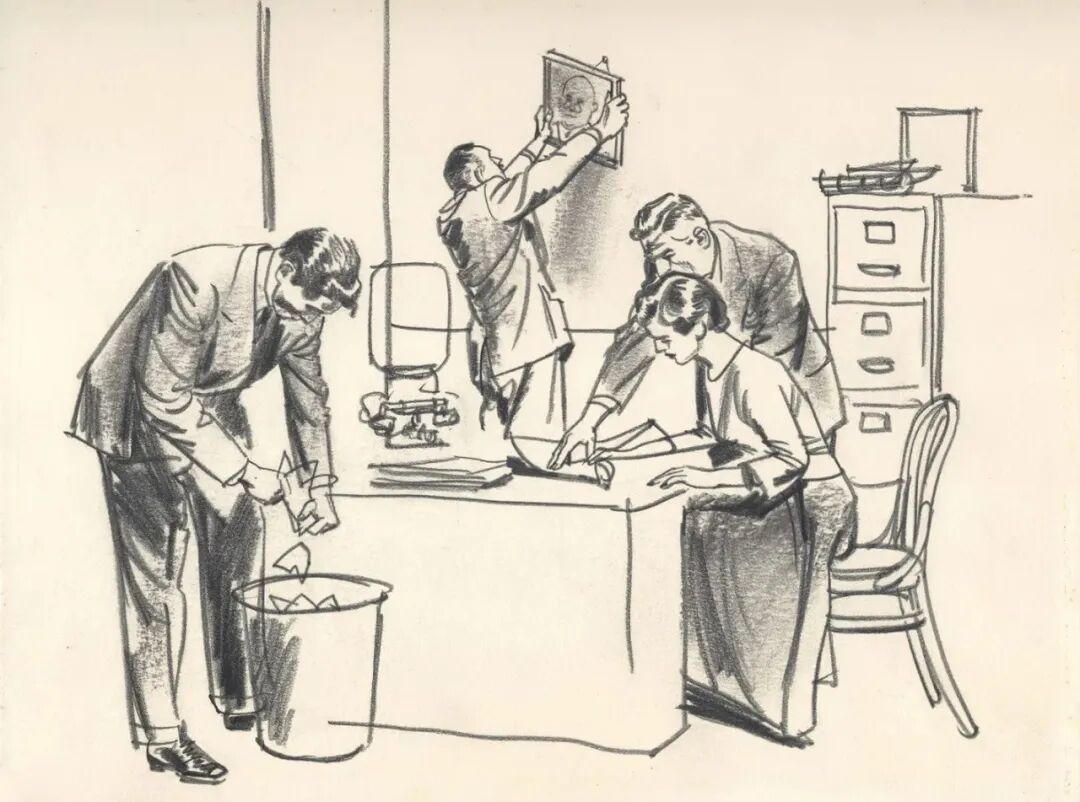 奥斯汀·布里格斯(Austin Briggs)的速写,给人最直接的感觉就是真实。 他不画那些摆好姿势的完美瞬间。 画里的人要么低头看表,要么侧身交谈,衣服领子可能都没来得及整理。 看着画,就会忍不住想: 他接下来要做什么?刚才发生了什么? 只留下最关键的动作和轮廓,其他都省略了。 他更在意那种“抓拍”的真实感。