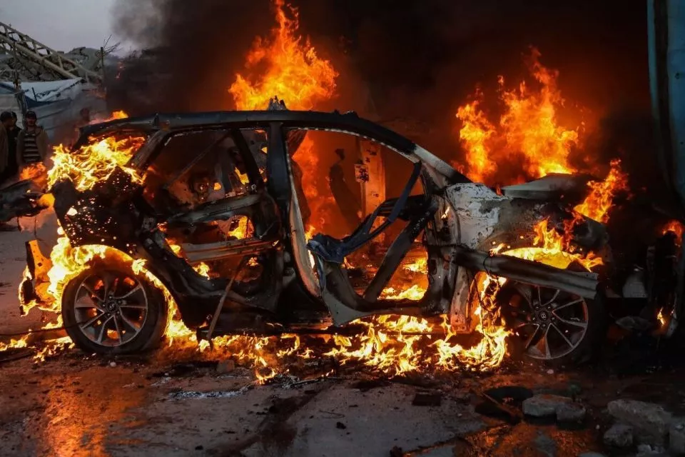 这是4月8日在加沙城拍摄的遭以军空袭后起火的车辆,车内一名半岛电视台记者遇难。