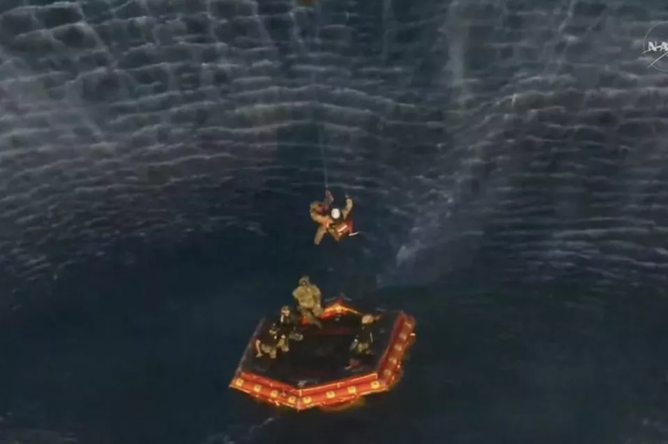 返回舱接触水面后,五个亮橙色的气球立即充气,以保持船体直立并防止倾覆。美国宇航局发布了宇航员返回地球的首批照片。