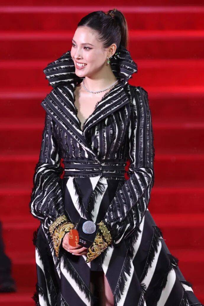 “速滑女王”谷爱凌身穿郭培(Guo Pei)2017秋冬高级定制系列的黑白条纹长裙亮相红毯,她造型霸气且带有“devil”风格,被赞气场全开、双面魅力十足。