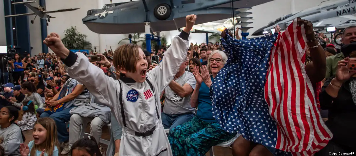 美国圣地亚哥航空航天博物馆,阿耳忒弥斯二号返回地球直播现场,一名身着宇航员服装的男孩在欢呼。图像来源: Apu Gomes/AFP