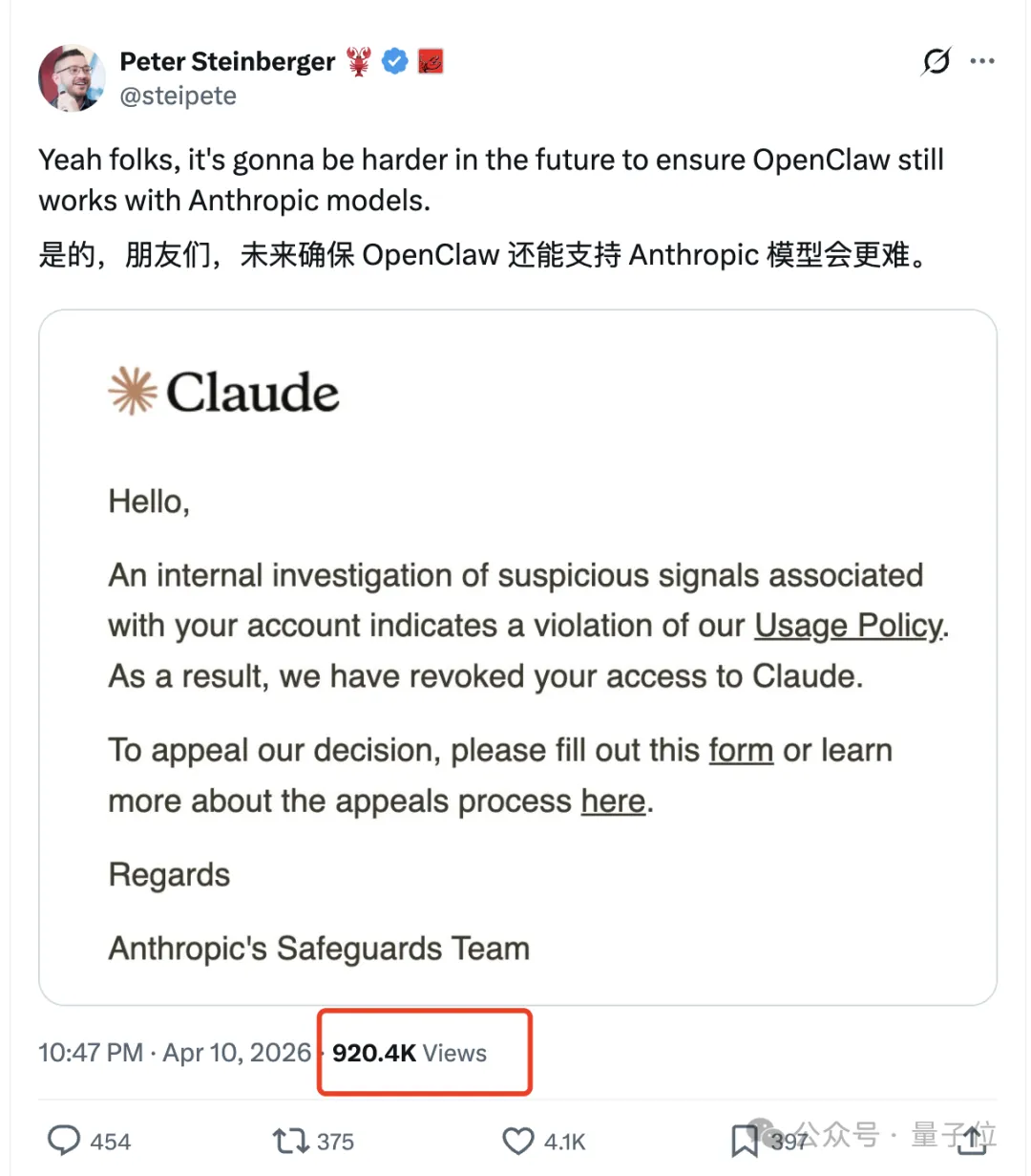 龙虾之父Claude账号被封量子位